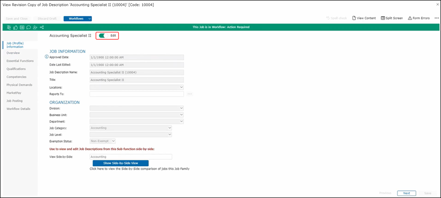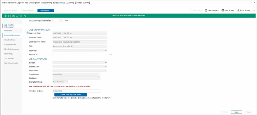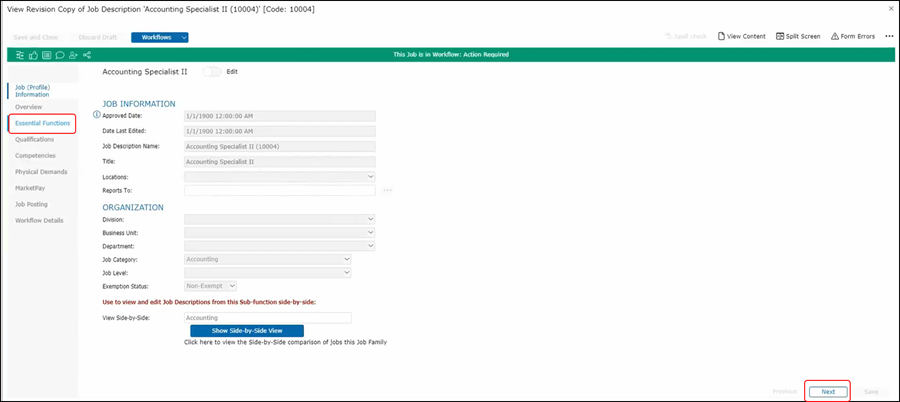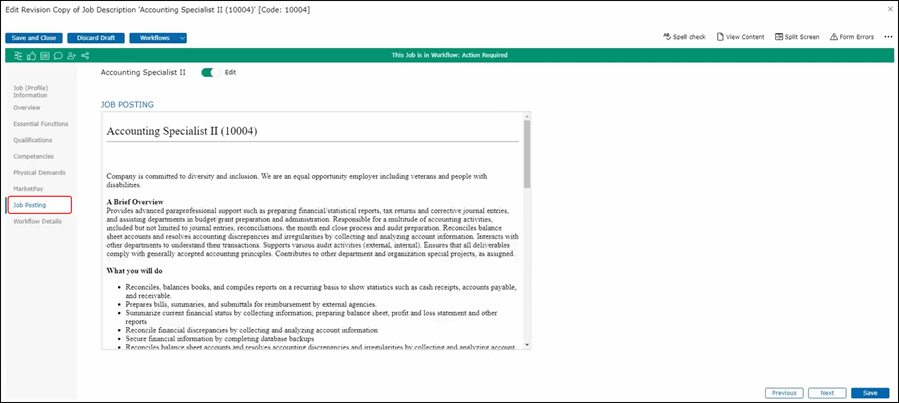 Once in the job description, Harry can see how the job description itself is organized by looking at each section on the left panel. Also so he can go to each section by clicking on the Next button or by just clicking on the appropriate section here on the left-hand side.