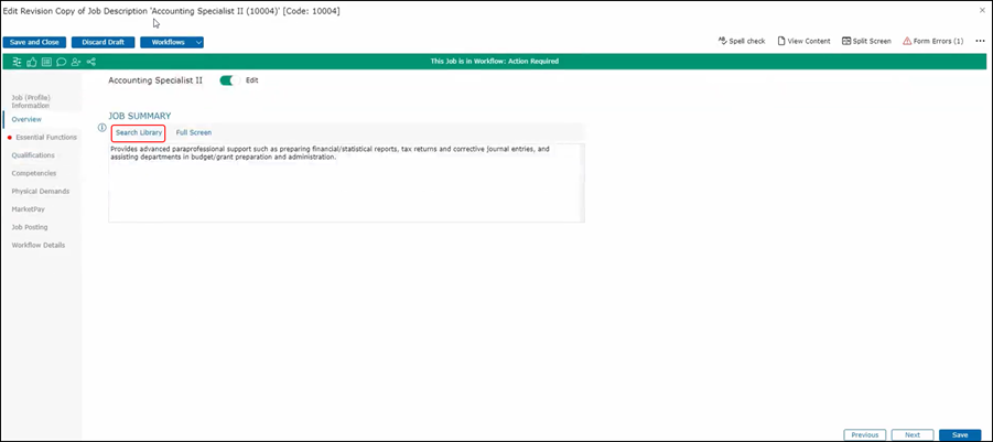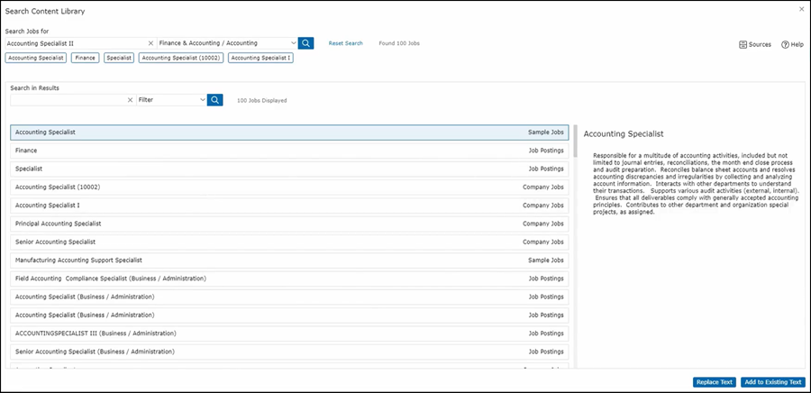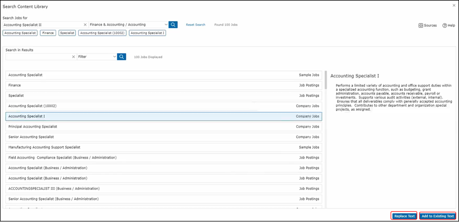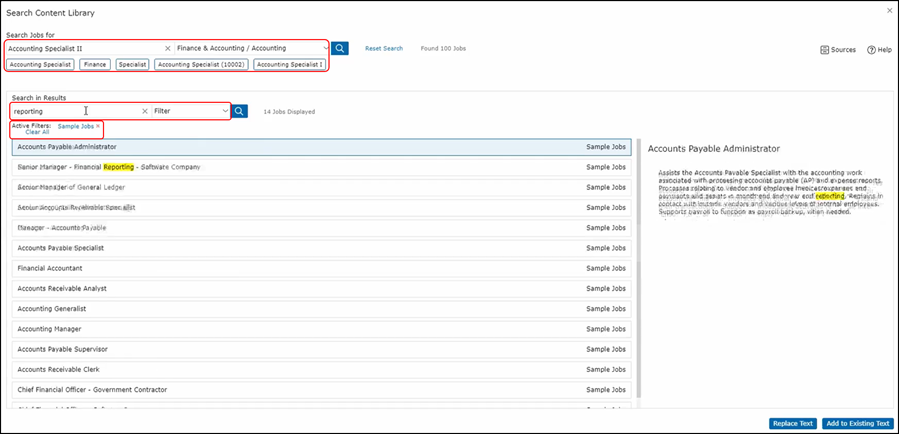 So, in the case of Job Summary, you can replace text in your job description with the text that you see in the search library. You can also add it to the existing text. Once you do that, you can further refine it within the job description itself.