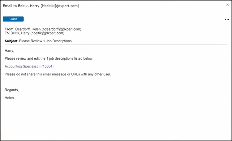 Most edits of job descriptions occur through the workflow. The email you see in front of you is what Harry could expect to see to initiate his review of the job description as part of the workflow for this job.