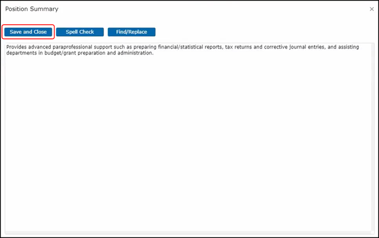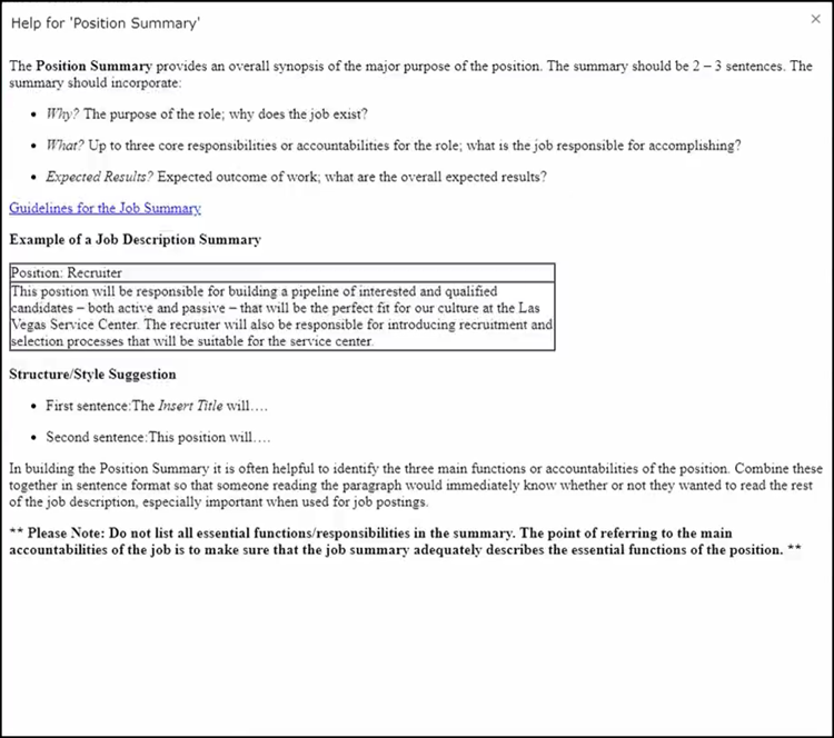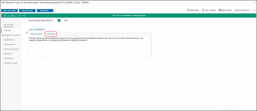 This is where we enter job summary information. We have a few different ways to do this. If you have text that you would like to copy and paste here, you can do so into the text box. If you would see your text in a full-page format, click on our full-screen option here and enter or view your data.