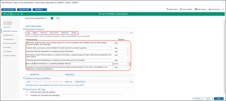 The Additional Responsibilities section typically contains information that's used for jobs that have responsibilities that require a time expenditure of less than 5 percent. The It will bring him right into the job description form. Required for All Jobs is usually a read-only field that companies may include to cover boilerplate responsibilities that are part of all job descriptions but are not itemized in Essential Functions.