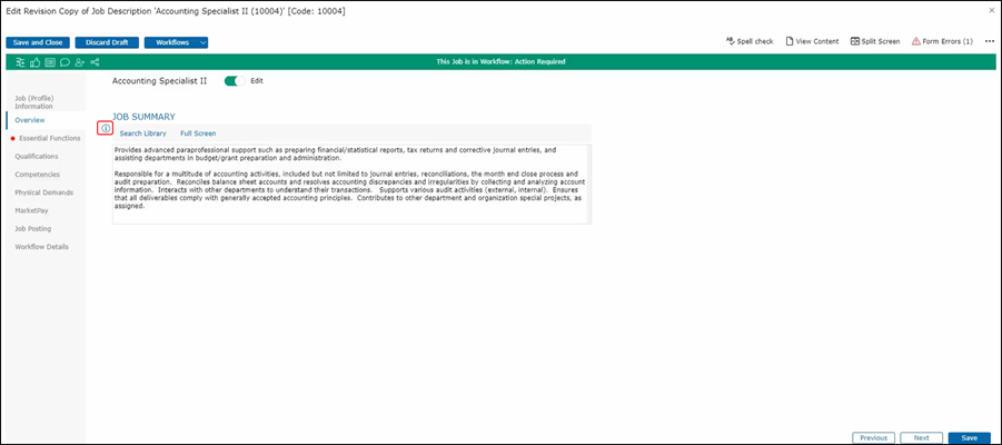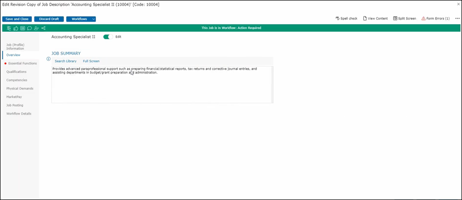 Moving on from the Job (Profile) Information page, we can advance to the Overview section.