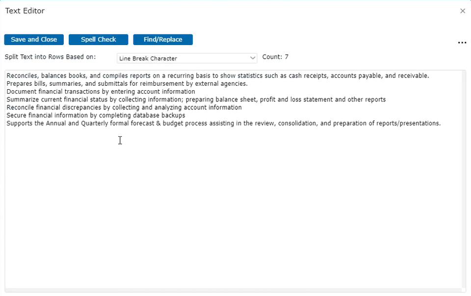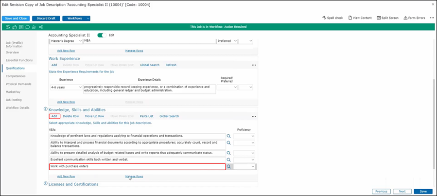 The Knowledge, Skills and Abilities section works very similarly to Essential Functions. You can Add and Delete rows manually, you can move them up or down and you can Paste List. The Global Search is also available which uses the Smart Search technology. An additional feature you’ll see here is a text editor.