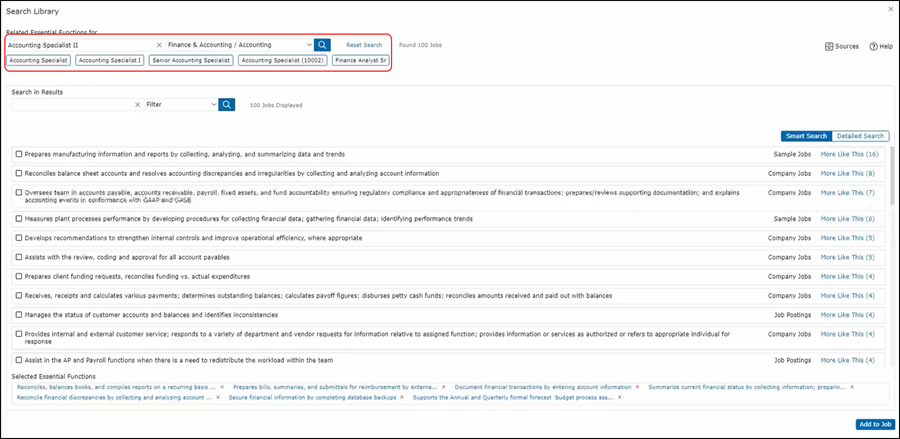 If you’d like to look for a different title, just change the title in the Search Jobs for text box. You can also search by Job Family and Sub-Families, and you have the option to filter out certain sources of job descriptions. So, for example, if you only want to see sample job descriptions, you can filter for only those job sources. You can also look for just job postings, company jobs, or crowd-sourced jobs. To search within the results, just enter the keywords you wish to use in the Search in Results text box.