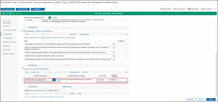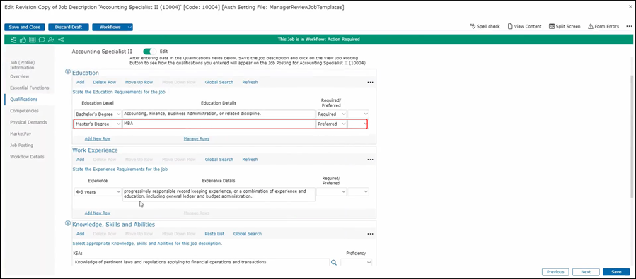 If posting your job summary, your essential functions, your qualifications, and your physical demands. You could also ask for marketing information or a company disclaimer. You can look at the posting from here or view it in job management or your job Library. You could also see it in situ as you work on your qualifications do. For example, if I want to look at my job posting while working on the qualifications, I can see that a Master’s degree is preferred however if I want to remove the Master's Degree, I can delete the row in JDX, save my job description and check the posting again. I'll see that the Master's degree is no longer there. This feature allows me to review the job posting a real-time once I save the job description.