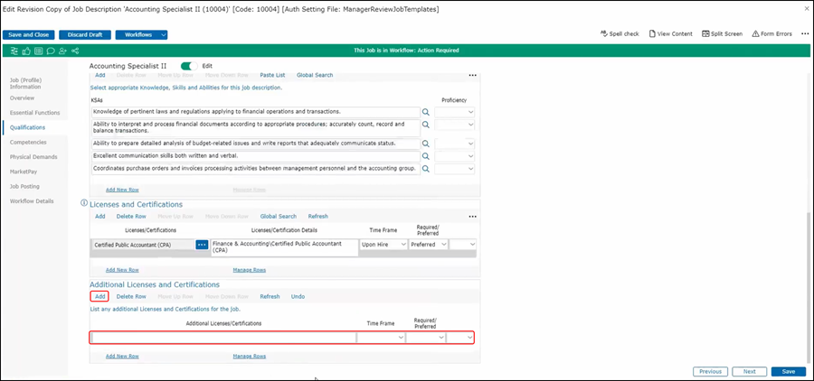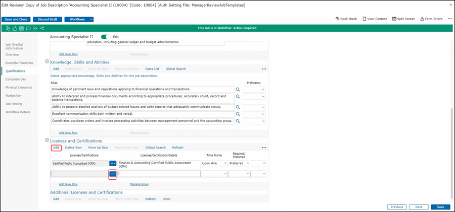 If you need one that's not on the list you could add it manually by going to Additional Licenses and Certifications, adding a row and simply entering the text in License and Certification. Then complete the same information for the time frame and whether it's required or preferred.