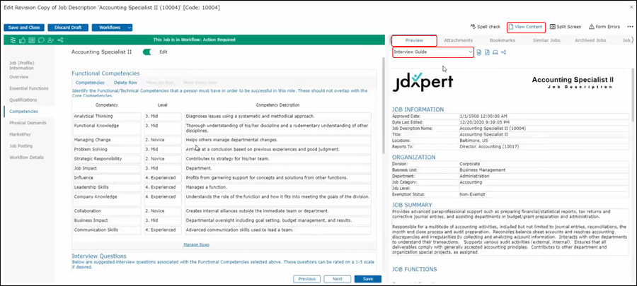 This will help you recruiters and your managers when it comes to getting them with the correct interview questions to help identify those competencies within candidates. Besides looking at these competencies within the job description form JDX provides you with an interview guide that pulls those questions into a document that could be shared with your managers and recruiters. If you go to view content, this will show you the print preview of your job description but by using the drop-down you will be able to locate the interview guide.