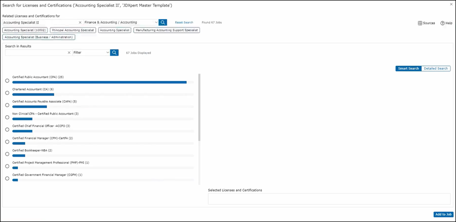 As we continue working for the Qualifications section, you are left with License and Certifications. Again, that you can use the search to help you determine whether similar jobs require a license or certification. Click on Search to start; you'll be greeted with a histogram that will give you a breakdown of the type of license and certification that can be expected for this kind of job. Here you’ll see the CPA is the first choice. Selecting this will add the license to the job description.