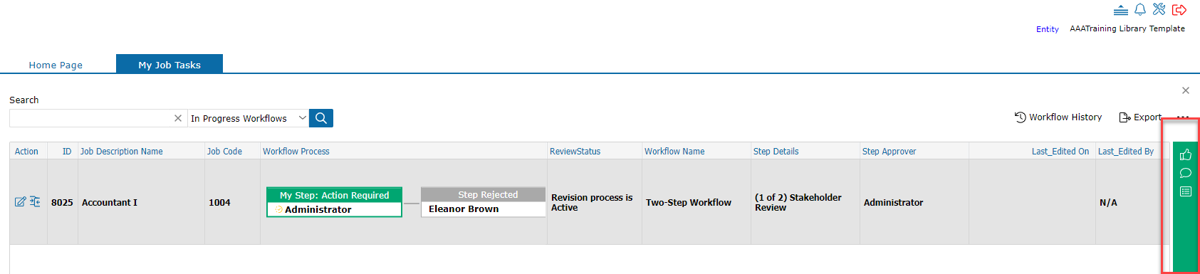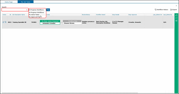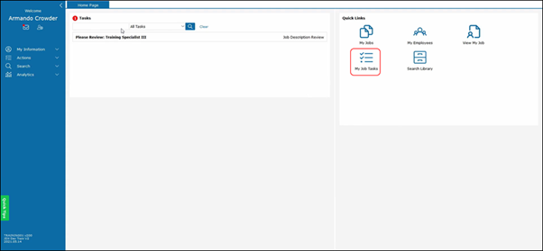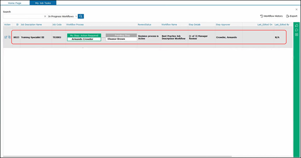 If you have no tasks that involve you, this icon will not appear. Within the My Job Tasks, you will see all tasks that are assigned to you. In this example, you will see a Training Specialist job description in workflow that needs to be completed.