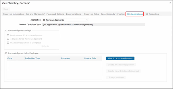 You can click through the tabs to see the Job description and Manager, Flags and Options, Impersonations, Employee Roles, Base/Secondary Positions, and JDX Applications.