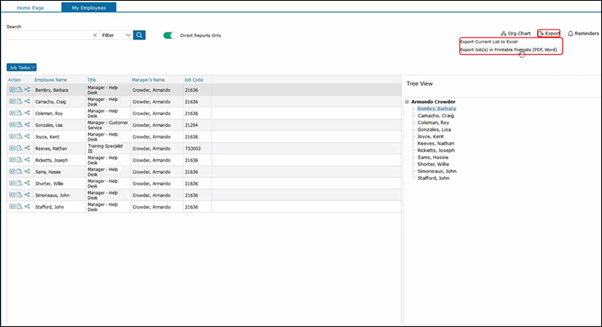 You can export this list of employees to Excel, or you can export the job descriptions of this list a printable format.