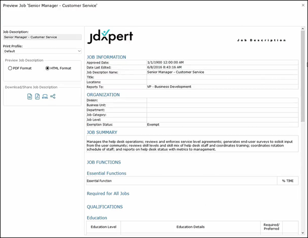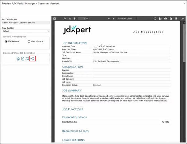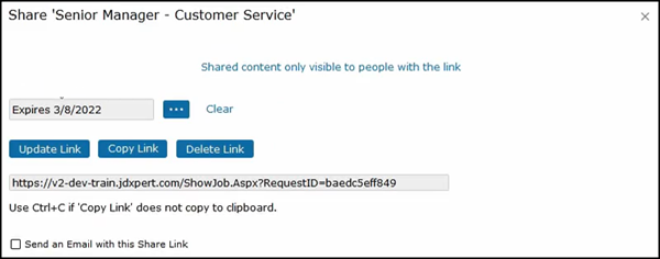 With this, we can share a link to the job description to anyone inside or outside of the organization so that the recipient or recipients can view the job description without having to log into JDXpert.