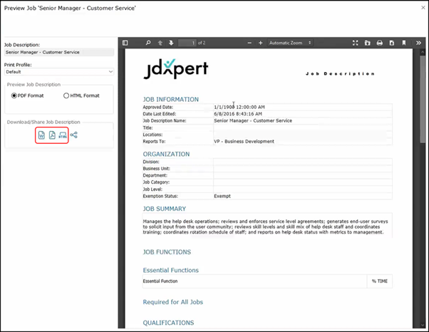 There are also some other actions that are available from this page; you can download the job description in Word format, PDF format, or HTML format by clicking on one of these three icons.