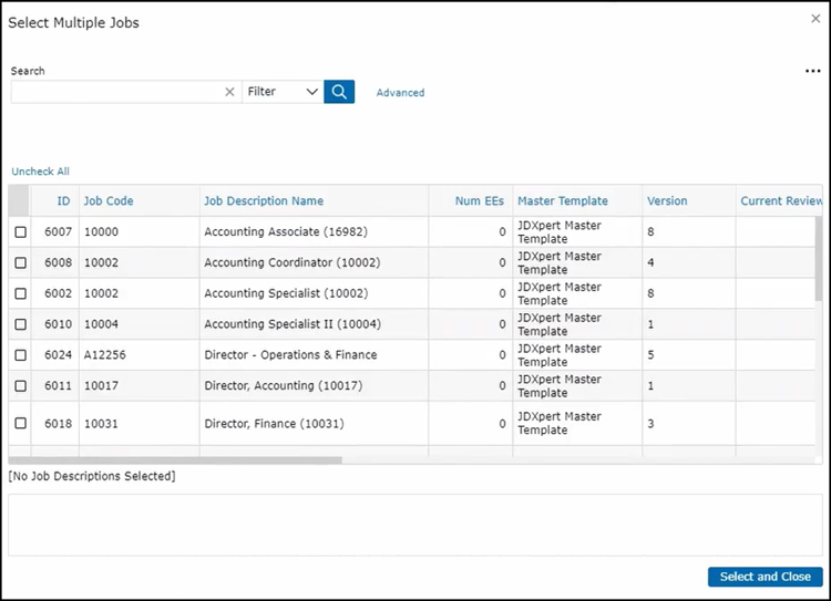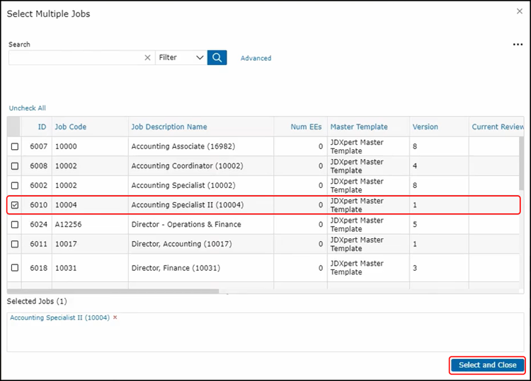 Here you may search for job descriptions by name or job code or by using one of the filters. For this purpose, we will select Accounting Specialist II. Click Select and Close.