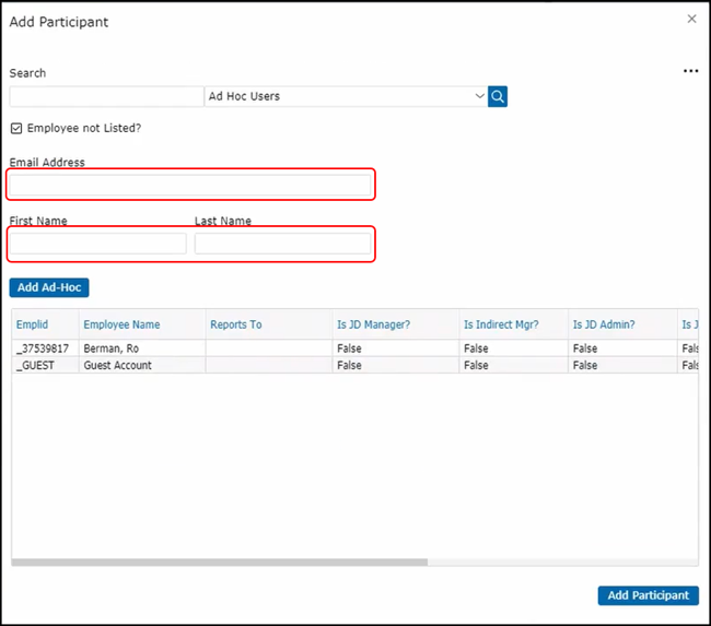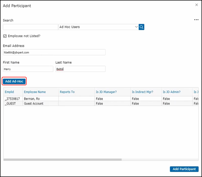 Since we don't have managers added in the system, we will use our ad hoc process that will allow you to enter an email address so they receive a link and can access the job description by email. Once the manager’s information is entered, you can add them as an ad-hoc reviewer by clicking on the add Ad-Hoc button.