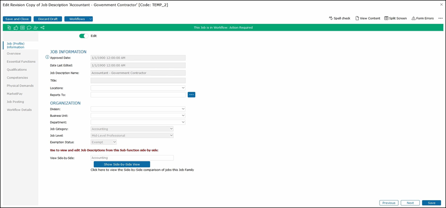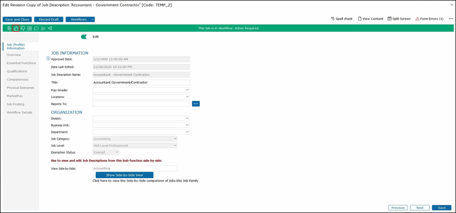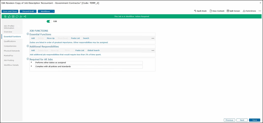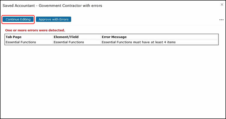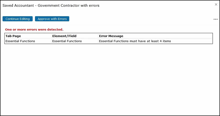 If we try to approve this job in its current state with no Essential Functions, an error message will pop up explaining the error.