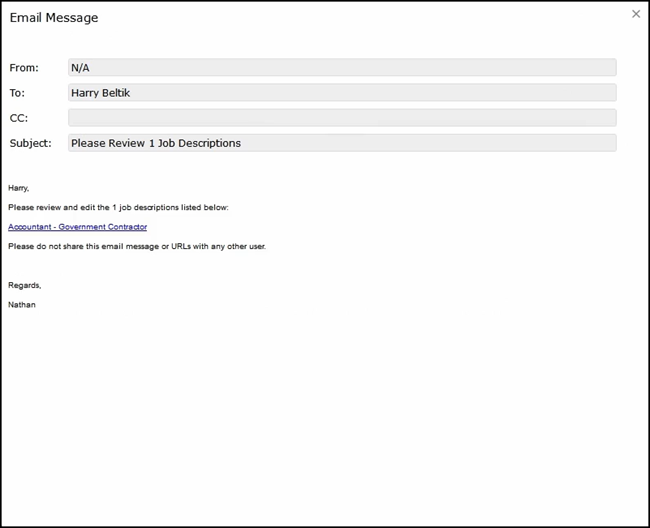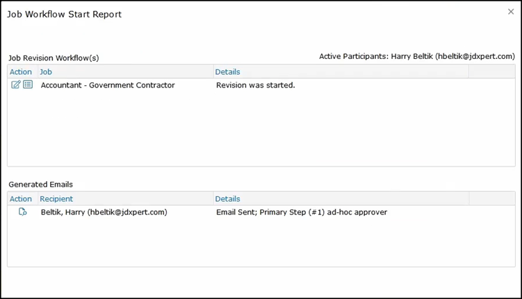 As you can see from the Job Workflow Start Report above, the workflow has started. This process will begin with generating an email sent to Harry so that he can begin editing the job. This is a sample of the email Harry would receive. He would need to click on the link to access the job description.