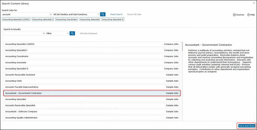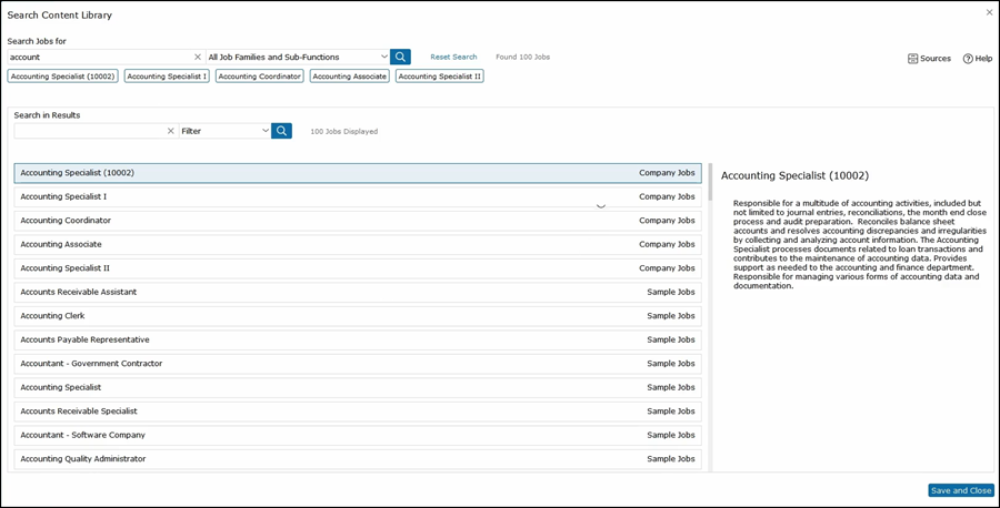 Use the search to find the type of job that you are looking for and hit enter. As you can see, there are a number of jobs to choose from. Sources include your own company jobs, sample jobs, job postings culled online and crowd-sourced content, which comes from JDXpert customers.