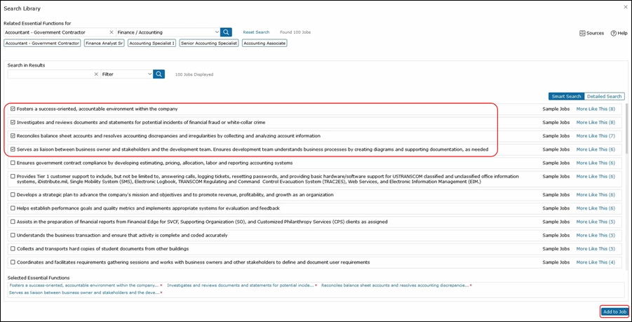 From here, we are going to search and select at least four essential functions. After making the selections, we can click Add to Job.