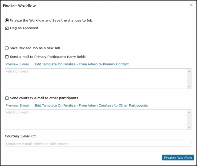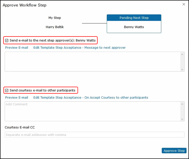 It shows that the next step in the process would be to send the job to Benny Watts. He can select Send email and add a comment. He can also send a courtesy email to all other participants.