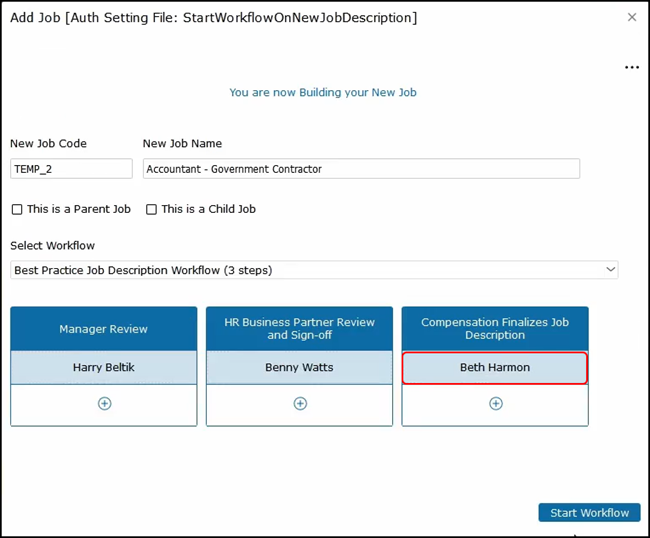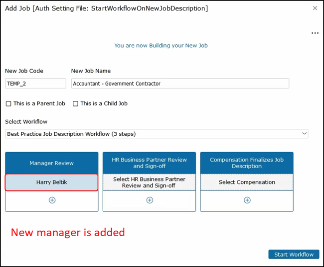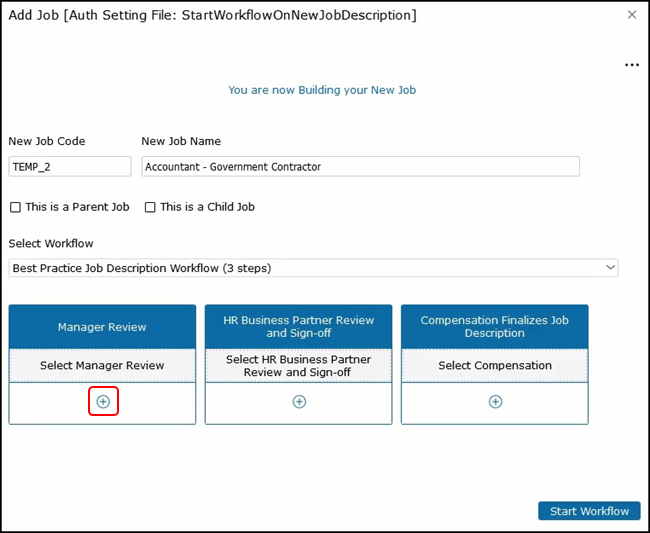 The next step is to select the workflow. Click on the dropdown and, for this example, we will select the Best Practice Job Description workflow with three steps. We will first need to assign a manager to review the job.