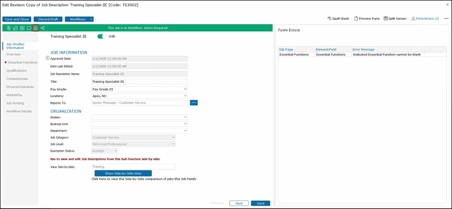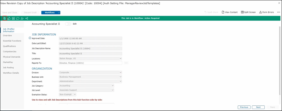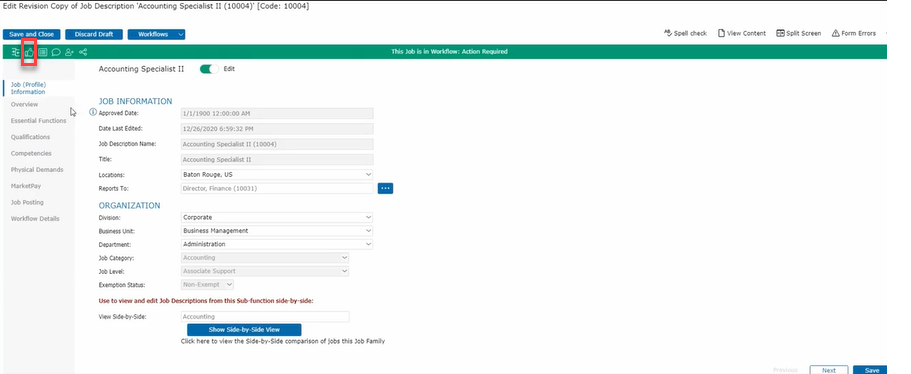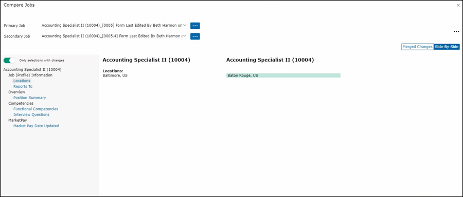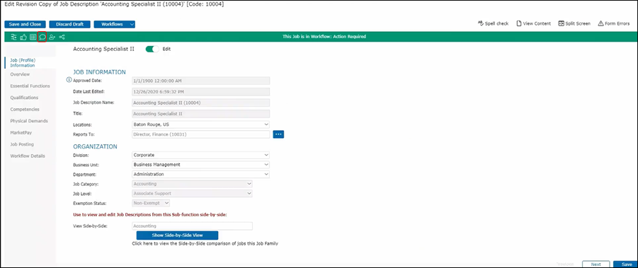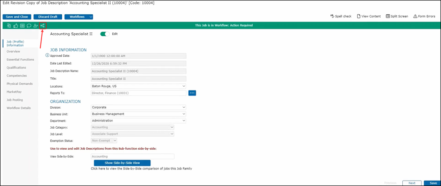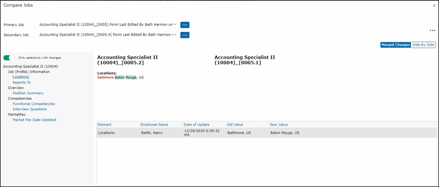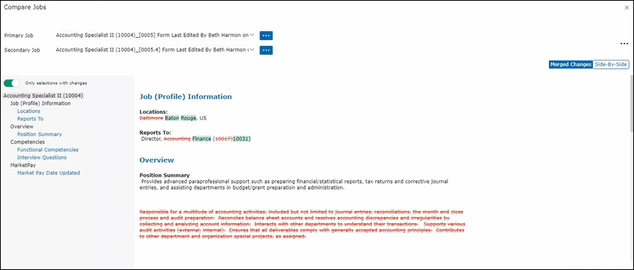 Here you will see all the changes that have taken place in this job description while in the workflow. The first thing you will see are the changes captured in track changes format.