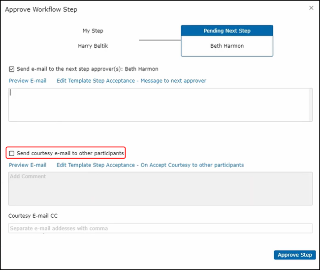 If you’d like to send a courtesy email along with a comment to other workflow participants, you can add them by clicking on the Send courtesy email to other participants checkbox and by adding the comment.