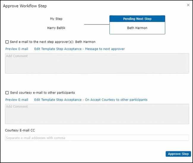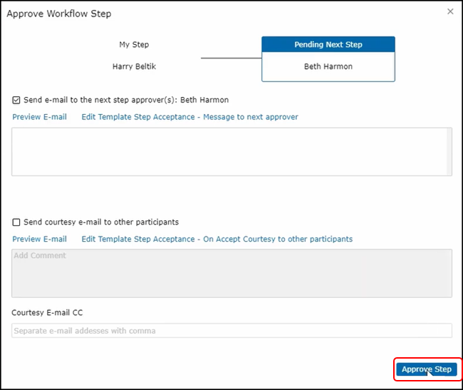 To set up an email to let Beth Harmon know that this is coming her way, just click on the Send email check box and add any comment you wish to add to the email template. If you’d like to send anybody else a courtesy email and they are not in the workflow, you can enter their email in the Courtesy Email CC box.