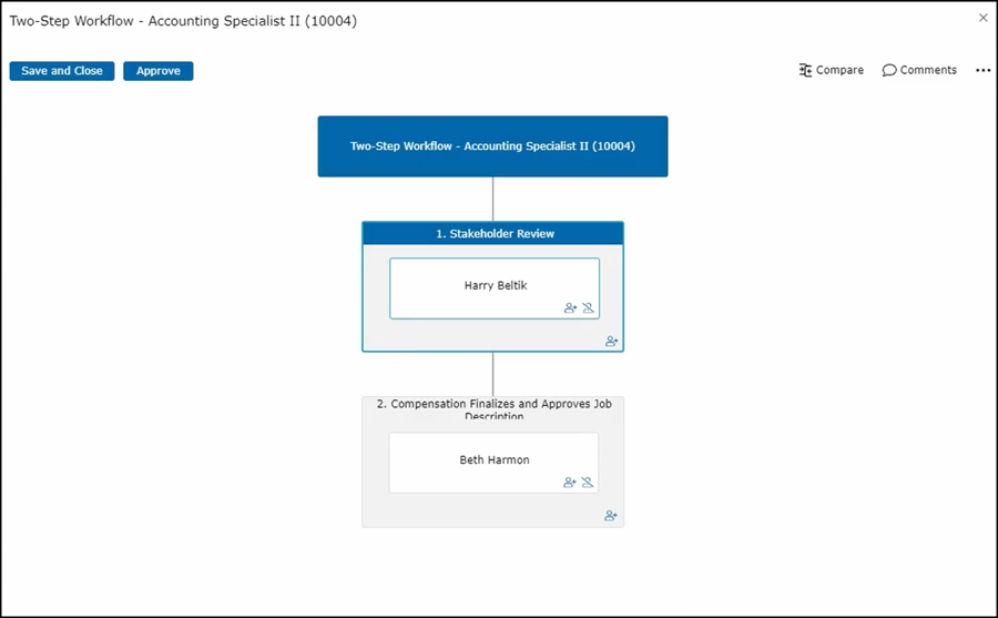 The approval window will appear, allowing Harry to approve the current step. The next step will show as pending, and we can see that Beth is up next for her review of the job description.