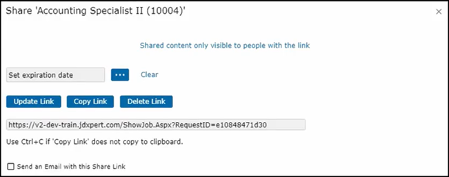 JDX will create a link that you can copy or get via email and send to whomever you choose. You also have the option to set an expiration date for viewing this job description.