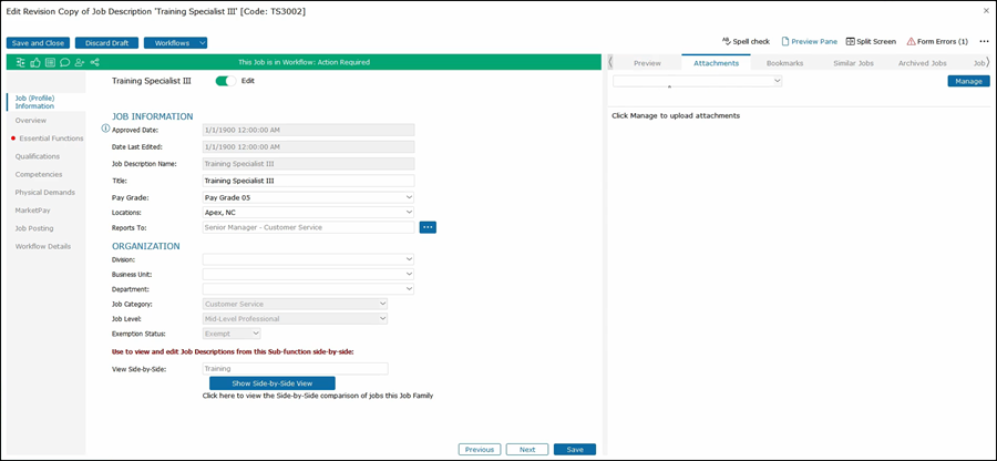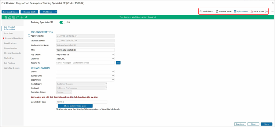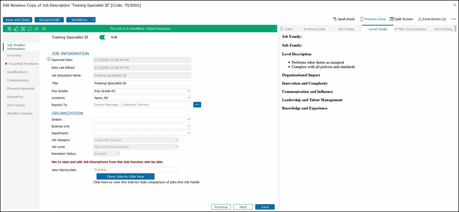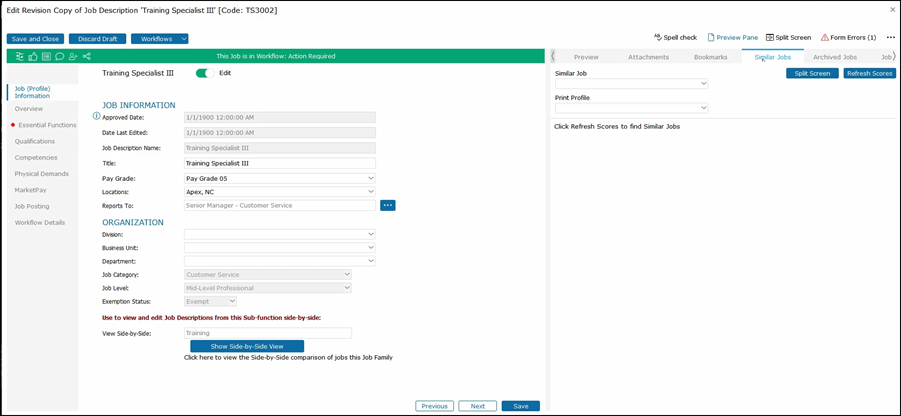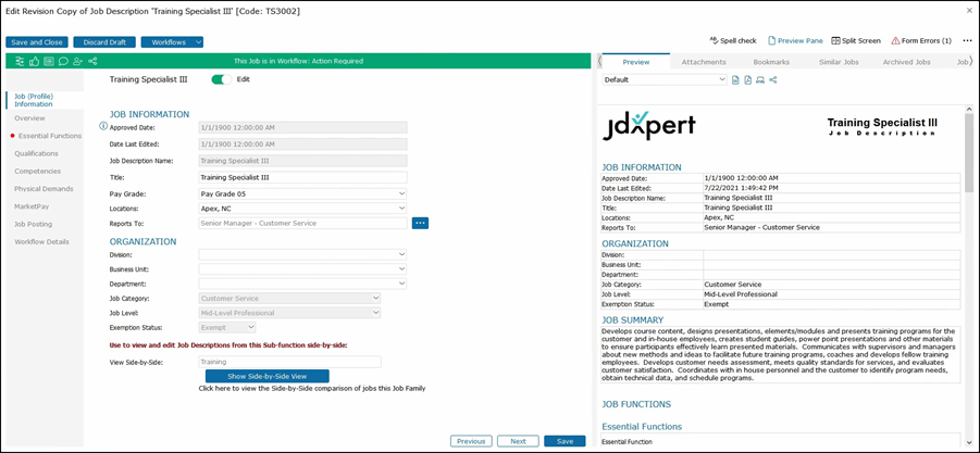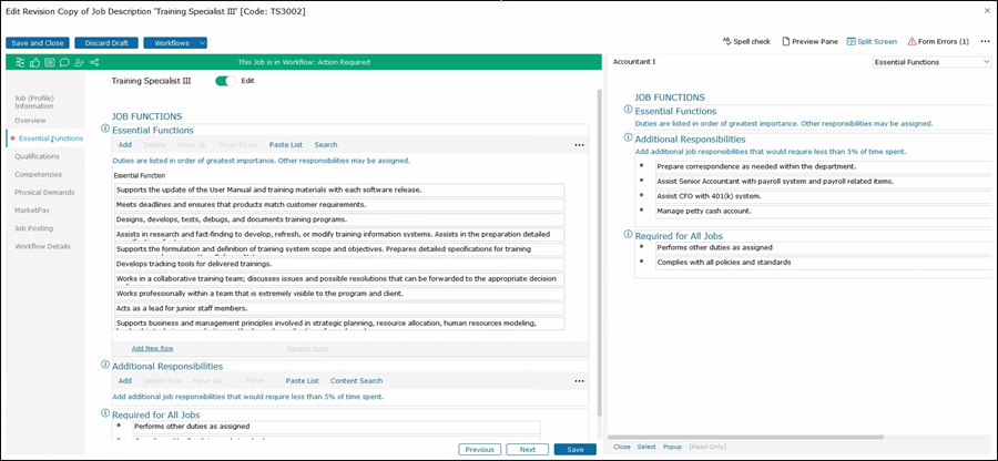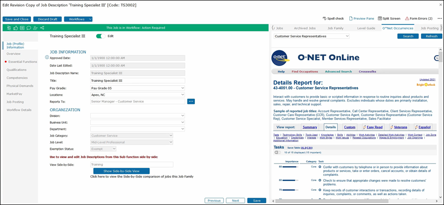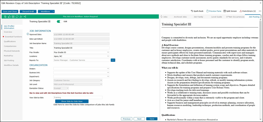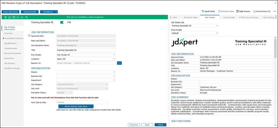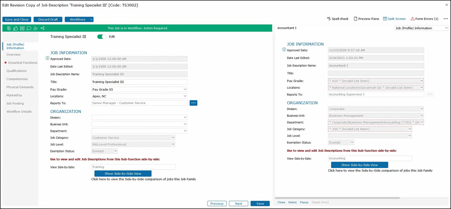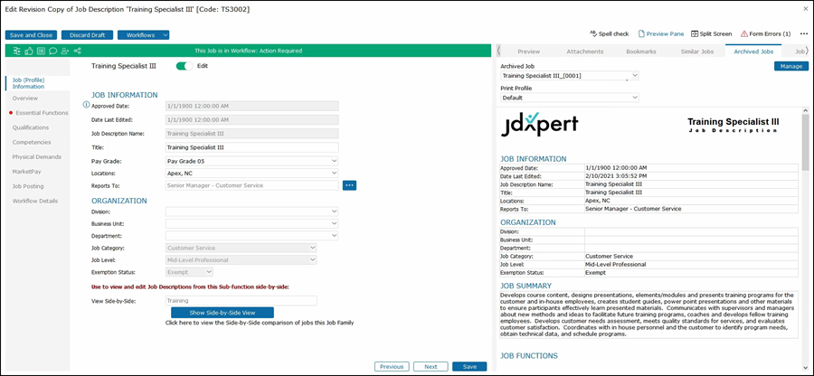 This will show the second job on the right side of the job description that you are editing. As you click through the tabs on the left side, both jobs that you are editing along with the job that you are comparing will be shown for that section.