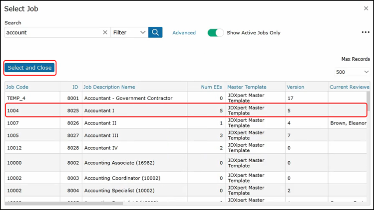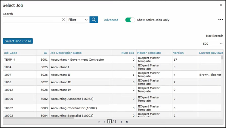 You can select a second job to view next to the current job that you are editing. Use the text search or filter to find the job description that you would like to compare. Once you have selected your job, click on Select and Close.