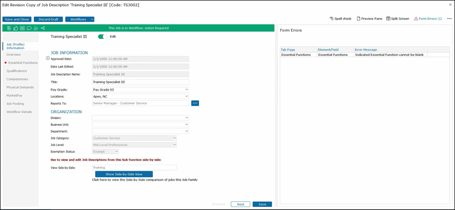 The last option across the top is the Form Errors. Clicking on this will show you a list of errors that need to be fixed before the job description is complete.